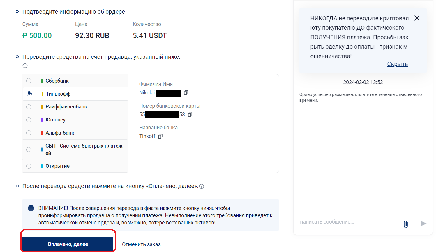 7. В окне оффера выберите ваш банк. Вы увидите номер карты, по которому нужно перевести деньги. Переведите деньги по этому номеру и нажмите «Оплачено, далее».