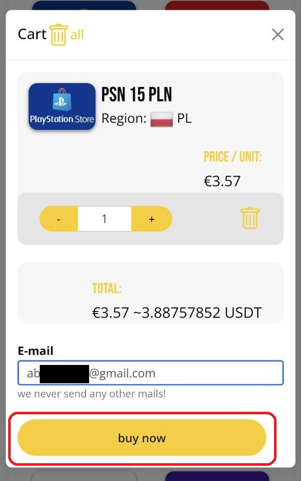 8. В окне корзины введите ваш адрес электронной почты. Проверьте внимательно – на него придёт карта пополнения. Нажмите Buy now.