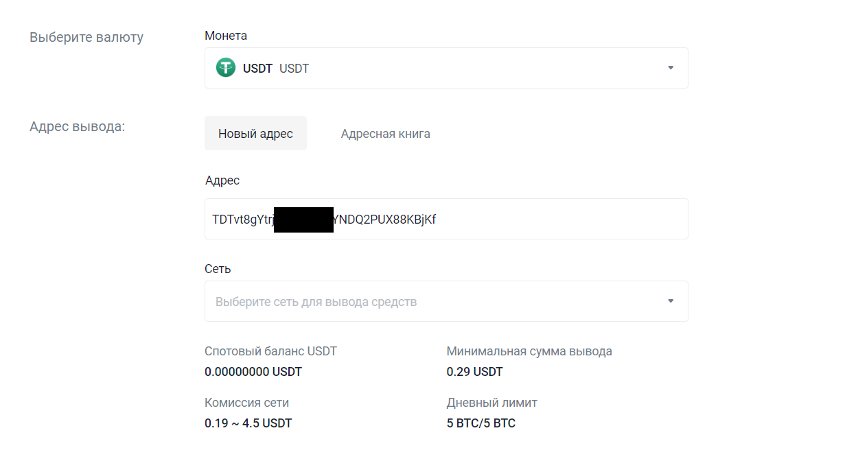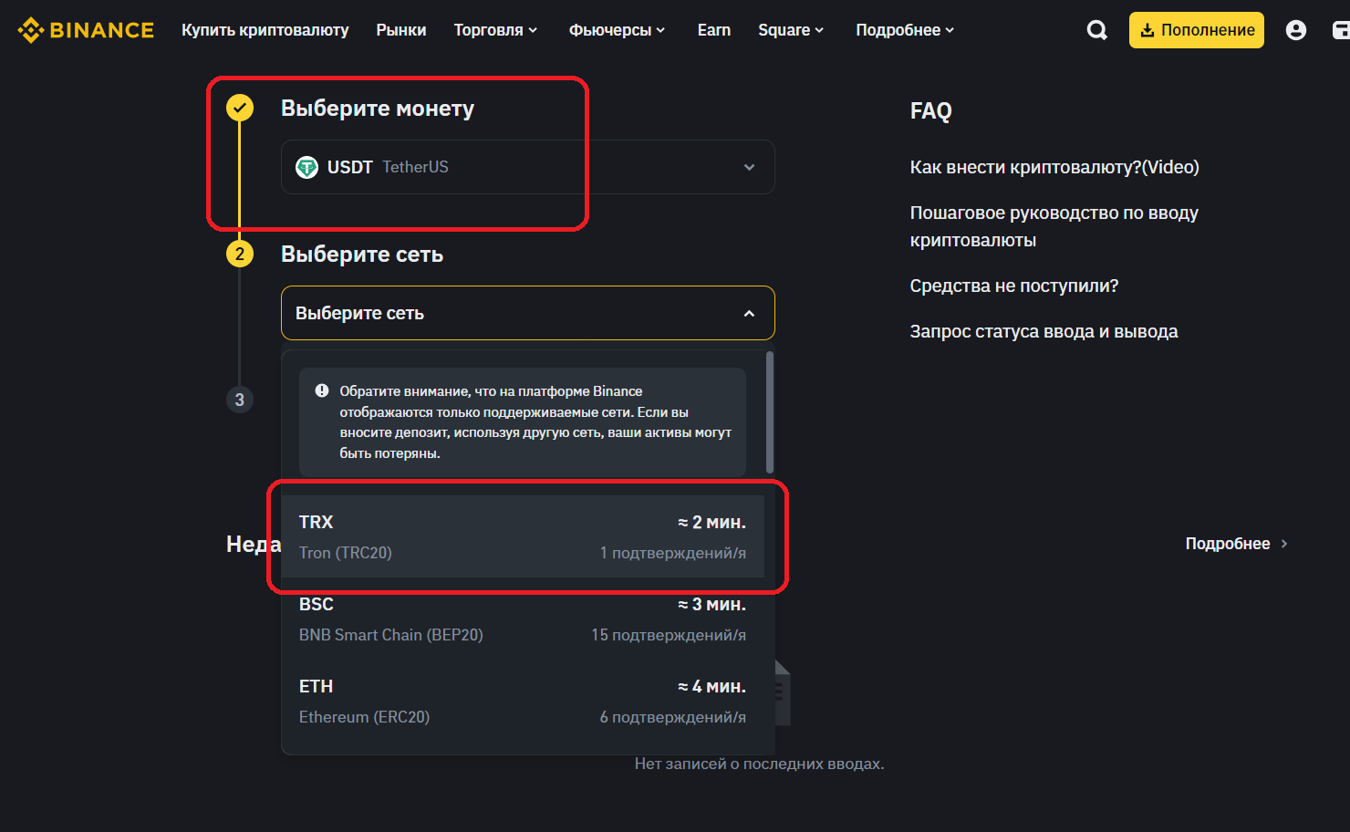 12. В меню «Выберите сеть» выберите сеть TRX Tron (TRC20).