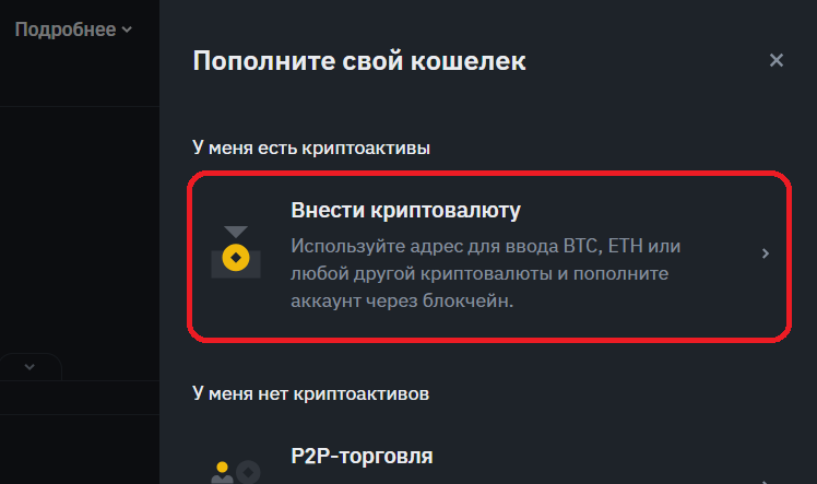 10. В открывшемся меню выберите «Внести криптовалюту».