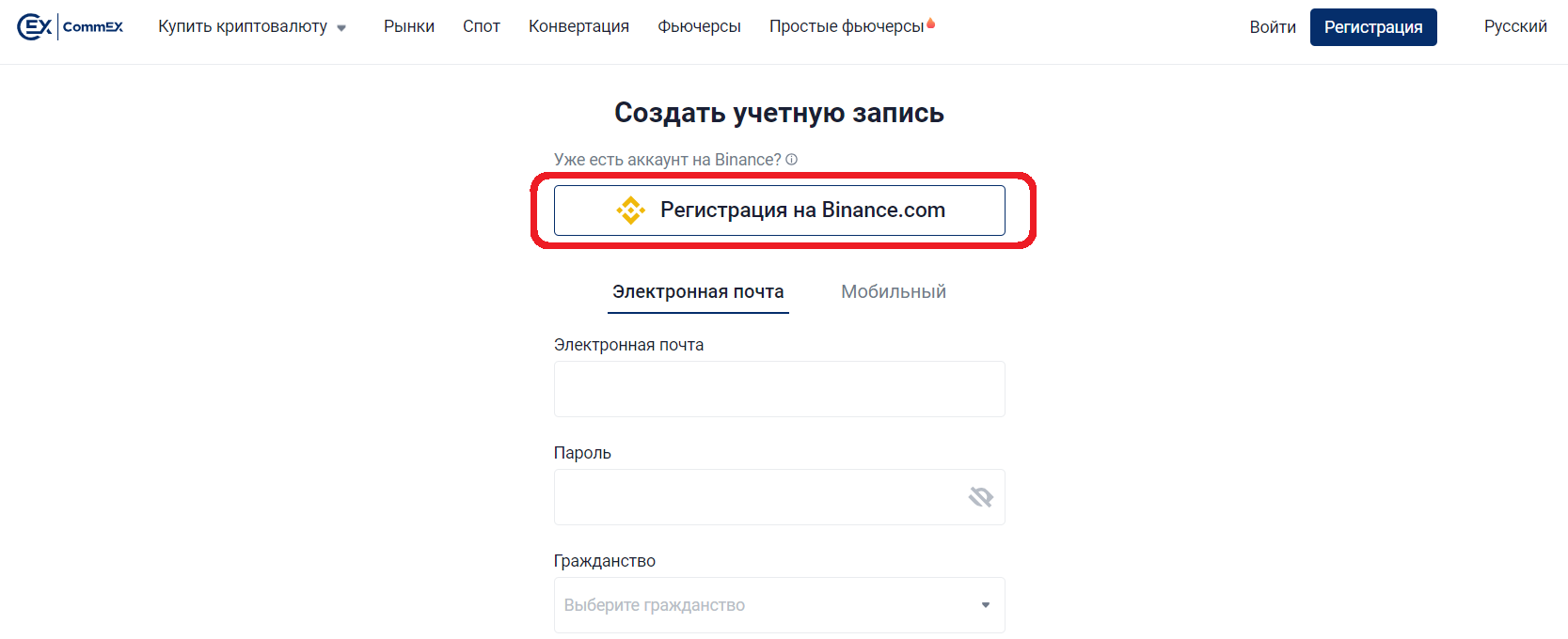 3. В окне регистрации нажмите кнопку «Регистрация на Binance.com».