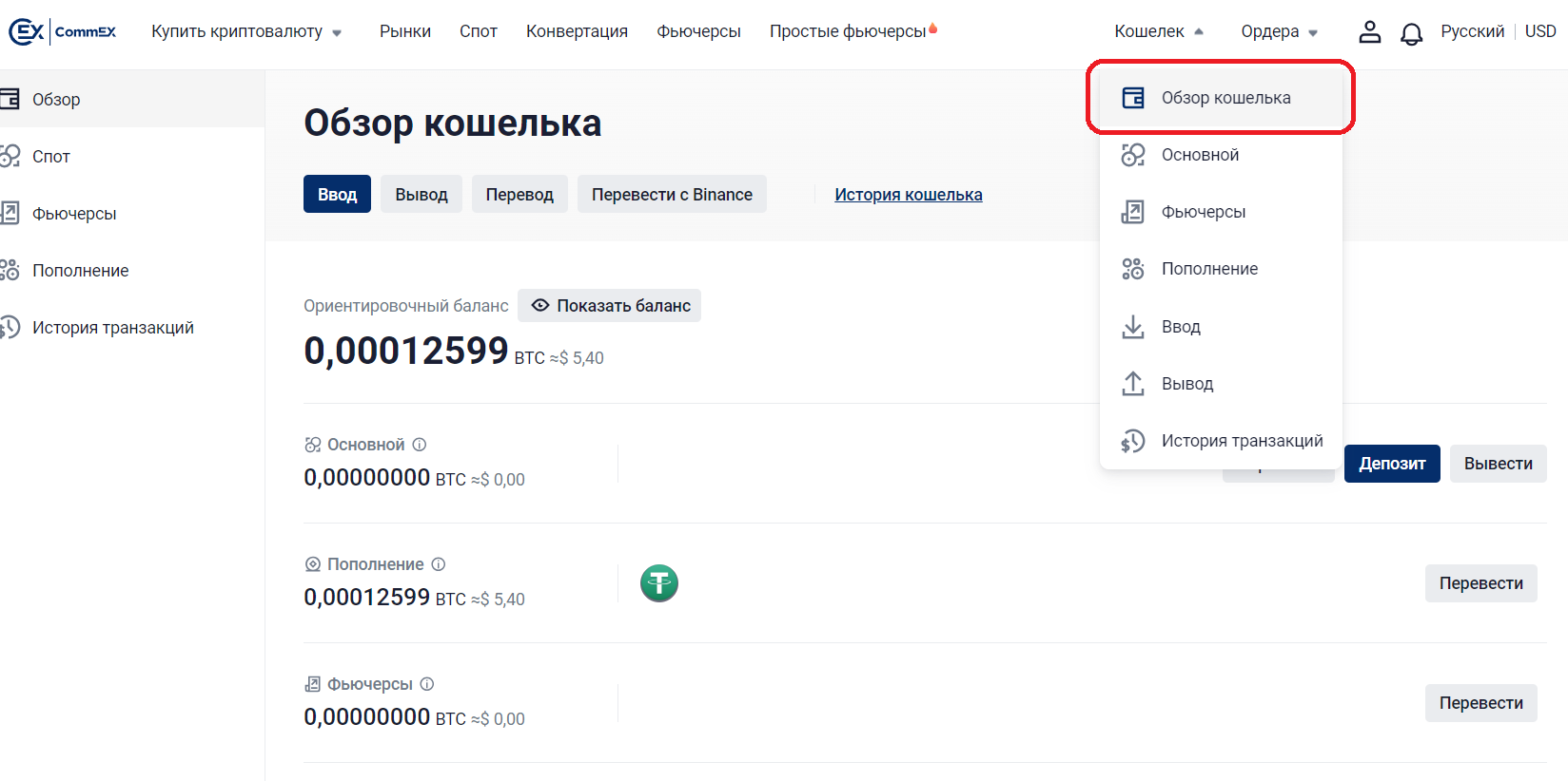 1. Перейдите в ваш Кошелёк на CommEX. Это можно сделать напрямую по ссылке https://www.commex.com/ru/my/wallet/account/overview или нажав на «Кошелёк» в правом верхнем углу и выбрав в выпавшем подменю «Обзор кошелька».