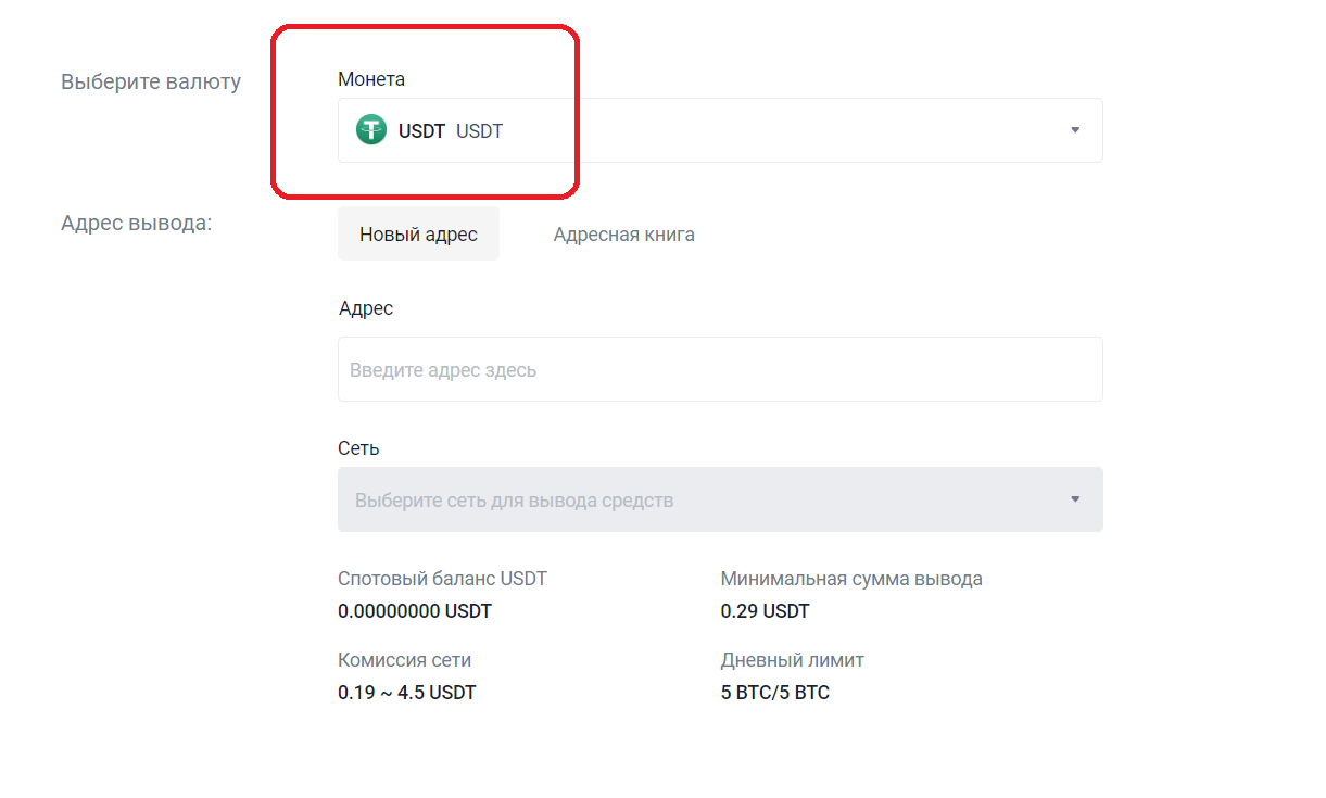 11. В меню «Выберите монету» выберите USDT.