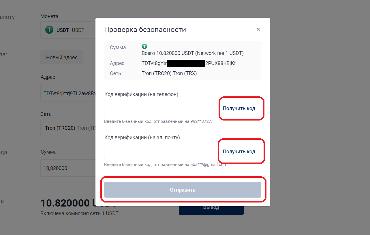 19. Теперь вам нужно ввести коды из СМС и почты. В окне подтверждения в строке «Код верификации (на телефон)» нажмите «Получить код», дождитесь СМС и введите код из него. В строке «Код верификации (на эл. почту)» нажмите «Получить код», дождитесь письма и введите код из него. Нажмите «Отправить».