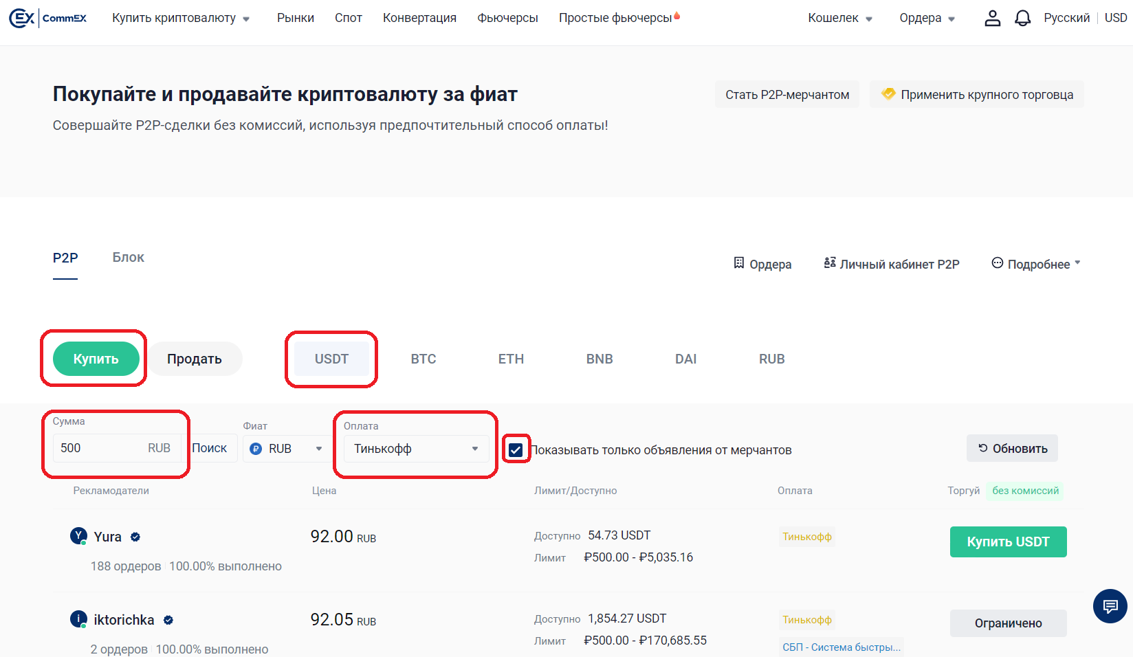 2. Покупка USDT на бирже CommEX.