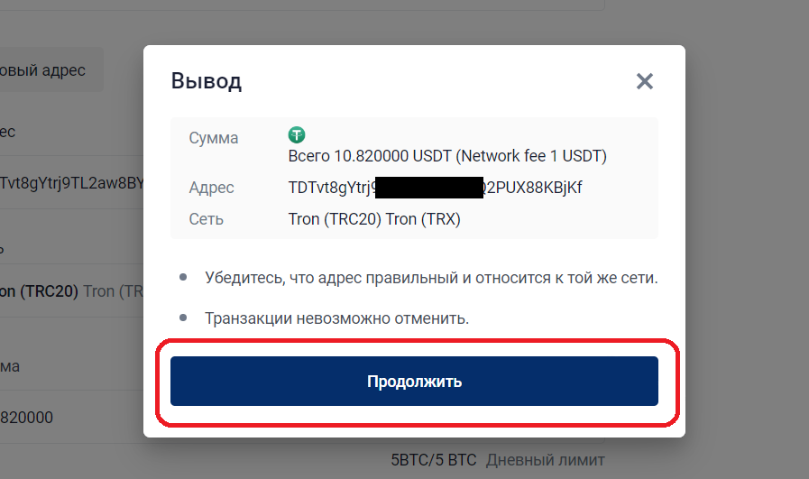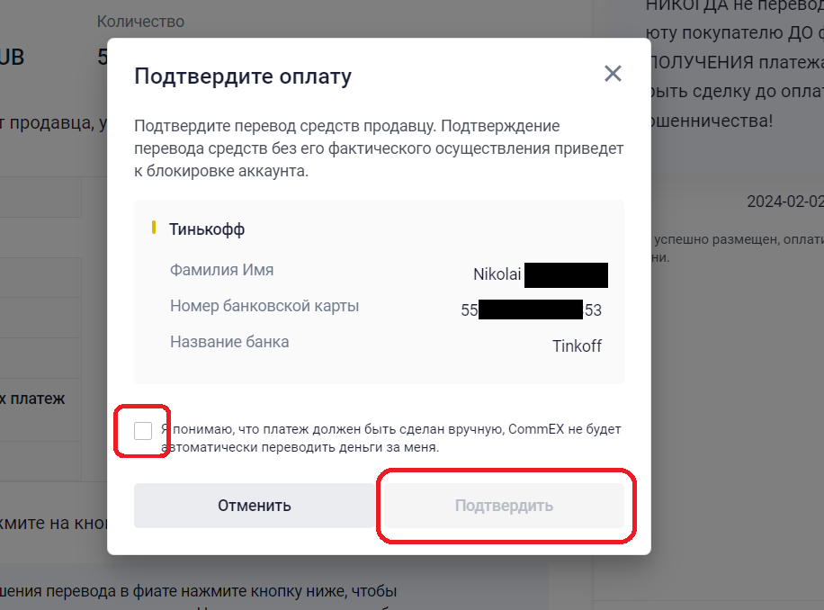 8. В окне подтверждения подтвердите, что вы перевели деньги на указанный адрес и нажмите «Подтвердить».