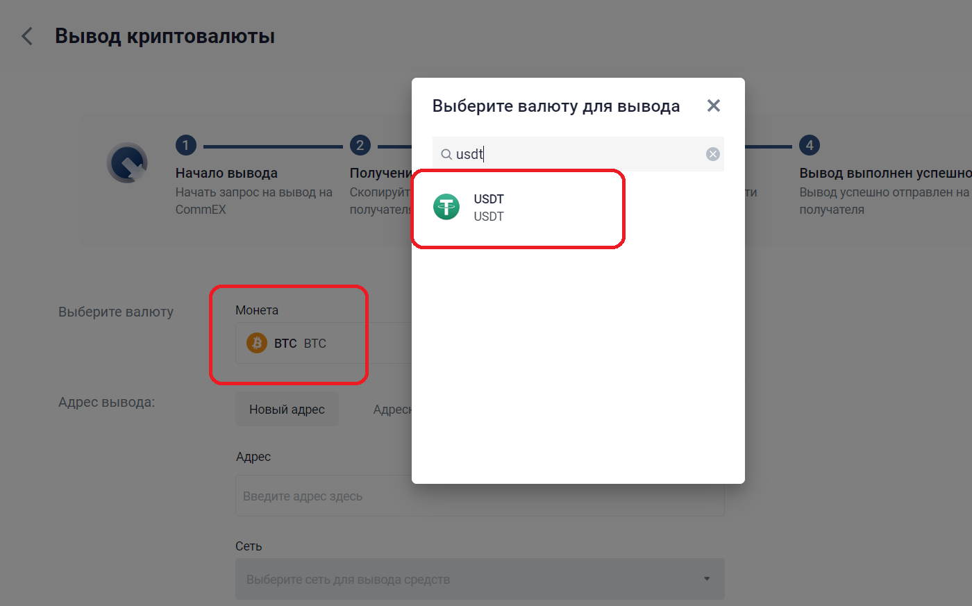 Покупка USDT на бирже CommEX