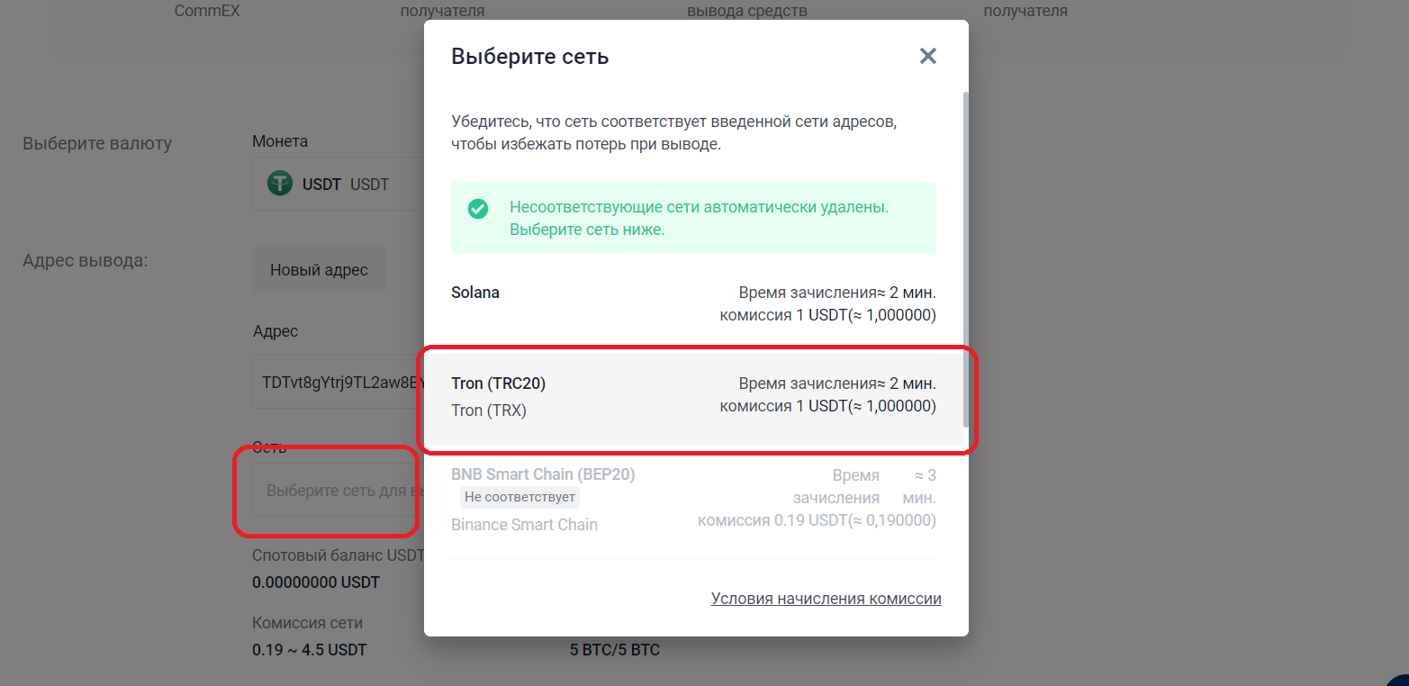 Перевод USDT с CommEX на Binance