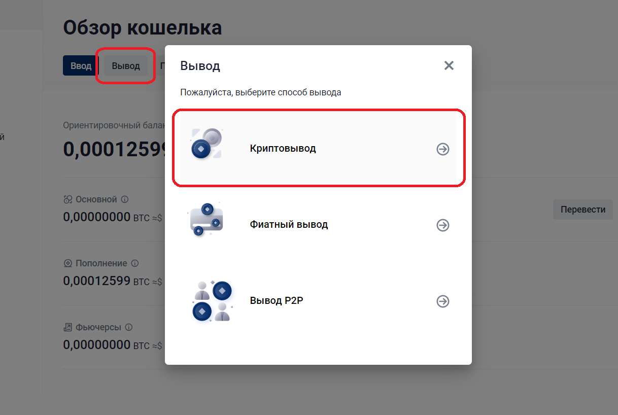 5. Нажмите кнопку «Вывод» и в открывшемся окне выберите «Криптовывод».