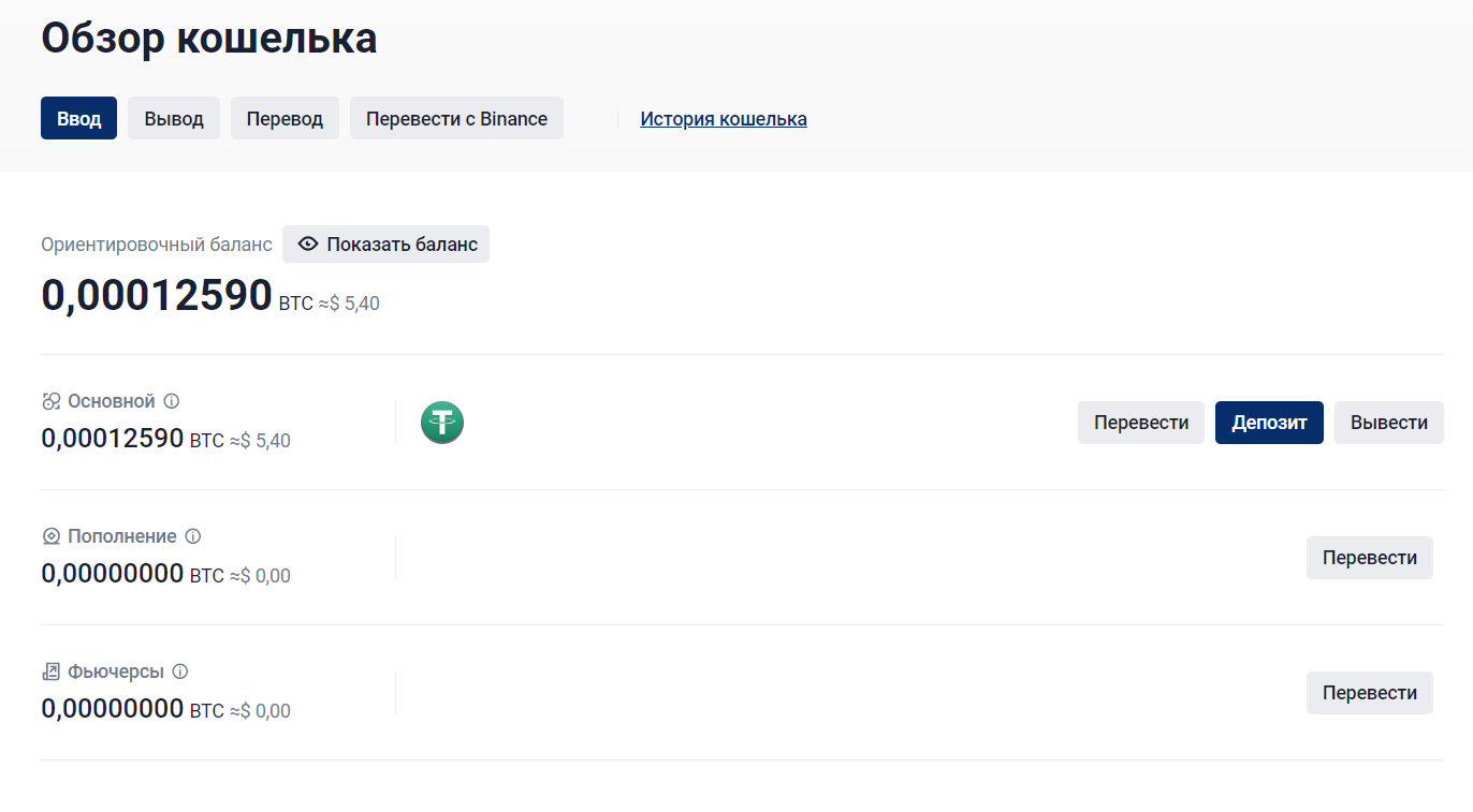 2. Около кошелька «Пополнение» нажмите кнопку «Перевести».