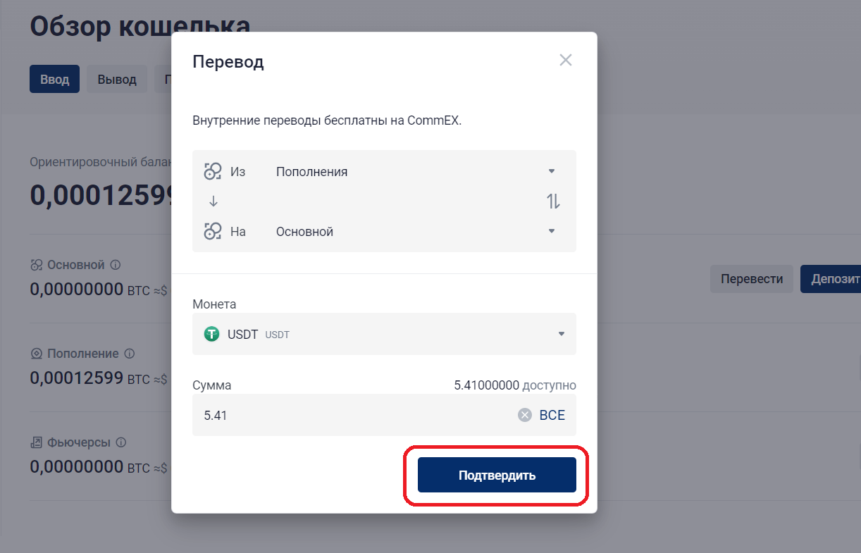 3. В открывшемся окне убедитесь, что в строке «Из» указано «Пополнения»; в строке «На» – «Основной», «Монета» – USDT. В строке «Сумма» нажмите «Все». И нажмите «Подтвердить».