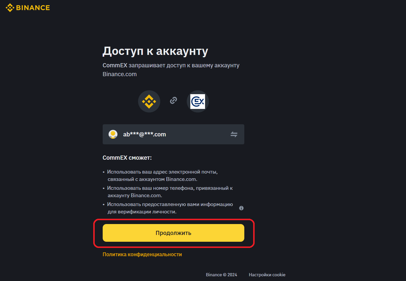 4. В окне авторизации Binance проверьте, что указан ваш аккаунт, и нажмите «Продолжить».