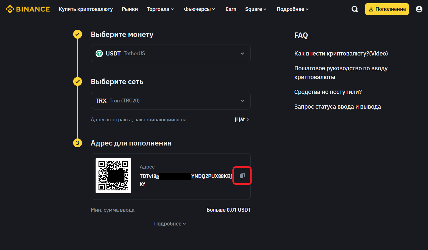 13. Вы получите адрес для пополнения. Скопируйте его, нажав кнопку «Копировать» рядом с адресом. Внимание! Адрес пополнения у каждого индивидуален. У вас будет свой адрес. Как номер карты.