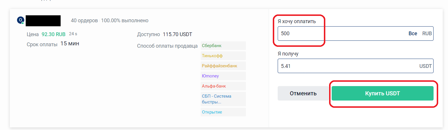 6. В окне создания оффера снова введите сумму и нажмите «Купить USDT».