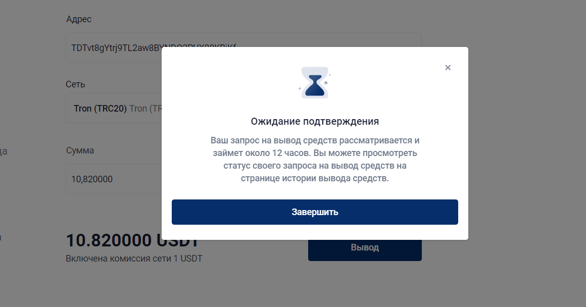 20. Вы увидите страшное сообщение про 12 часов на вывод. Не бойтесь, деньги придут сразу. Просто нажмите «Завершить».