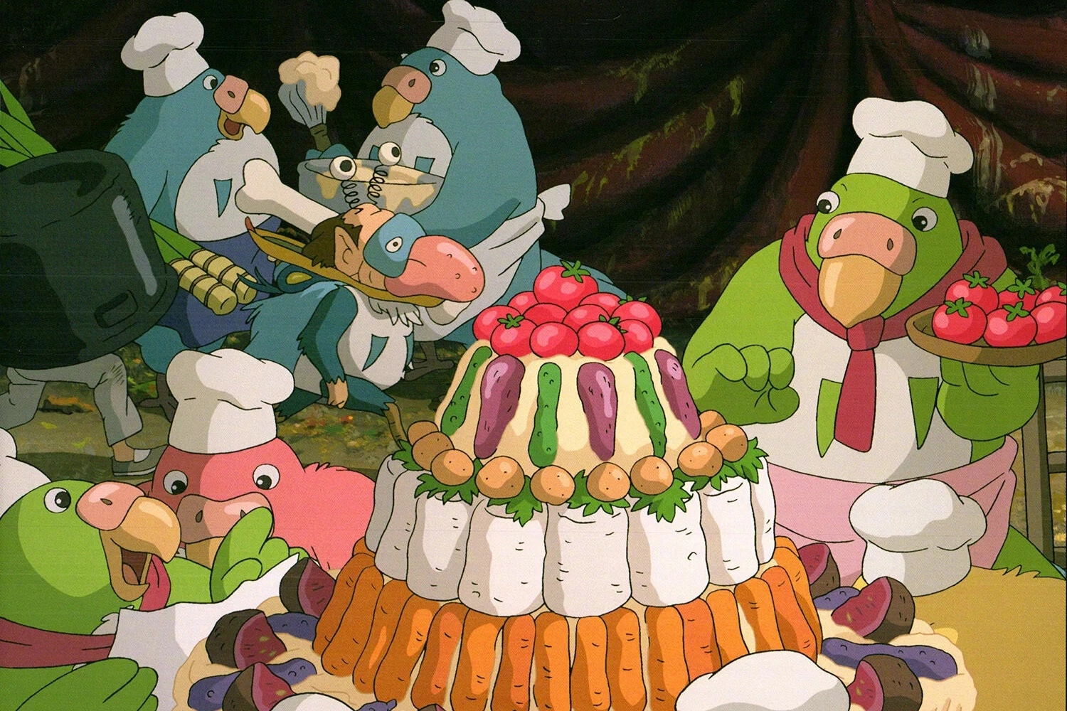 Примерно в том же направлении создавался образ попугаев. Это также могут быть японцы или любое другое общество в воинствующий период. Их лидер – явная отсылка к Муссолини или любому другому военному тирану. Птицы даже питаются плотью, что уже ужасает, ведь попугаям это не свойственно.