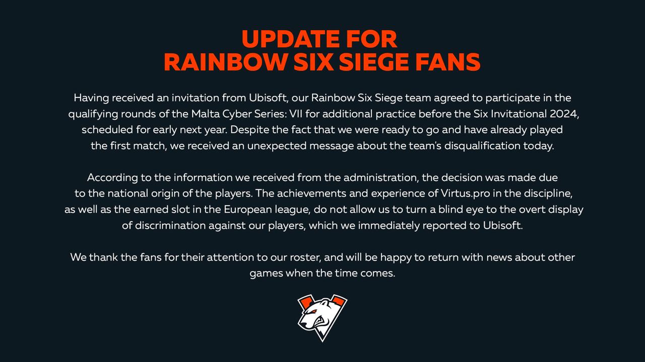 Команду Virtus.pro по Rainbow Six Siege дисквалифицировали с Malta Cyber Series: VII