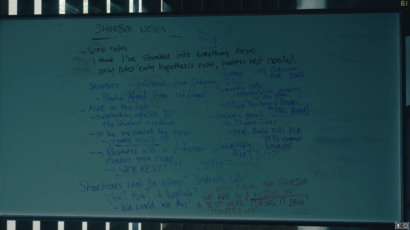 Обувная коробка. Хранит рукописи Томаса Зейна и Выключатель. Упоминается в Alan Wake, This House of Dreams, Control, AWE.