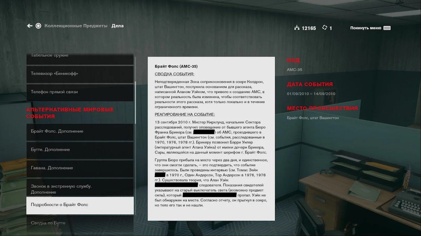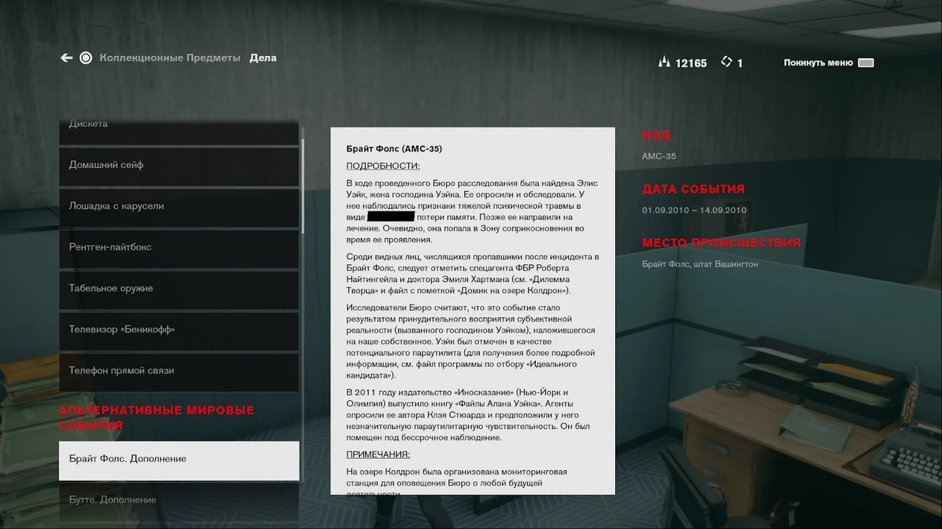 И, разумеется, один из документов в Control указывает, что ФБК расследовало АМС в Брайт-Фоллз. Для этого они опросили Томаса Зейна, Тора и Одина Андерсонов (Old Gods of Asgard) и Элис Уэйк. Они пытались найти и самого Алана Уэйка, но безуспешно.