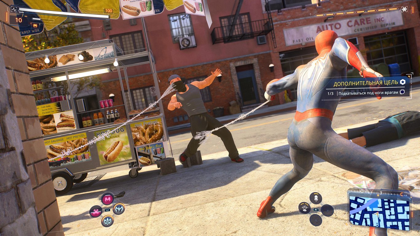 Хорошо доработали возможности использования паутины в бою. Теперь она используется не только для того, чтобы подтянуться к врагу или вырвать у него из рук оружие, а превратилась в полноценную «боевую единицу». В базе осталась возможность приблизиться к противнику или же подтянуть его к себе, однако дополнительно паутина может использоваться для контроля. Например, можно вырвать оружие у врага и тут же с силой швырнуть его обратно – достаточно своевременно нажать R1. А если нажать R2 и направить стик в нужную сторону – получится оттащить противника, чтобы загнать его в ловушку или банально сбросить с крыши.