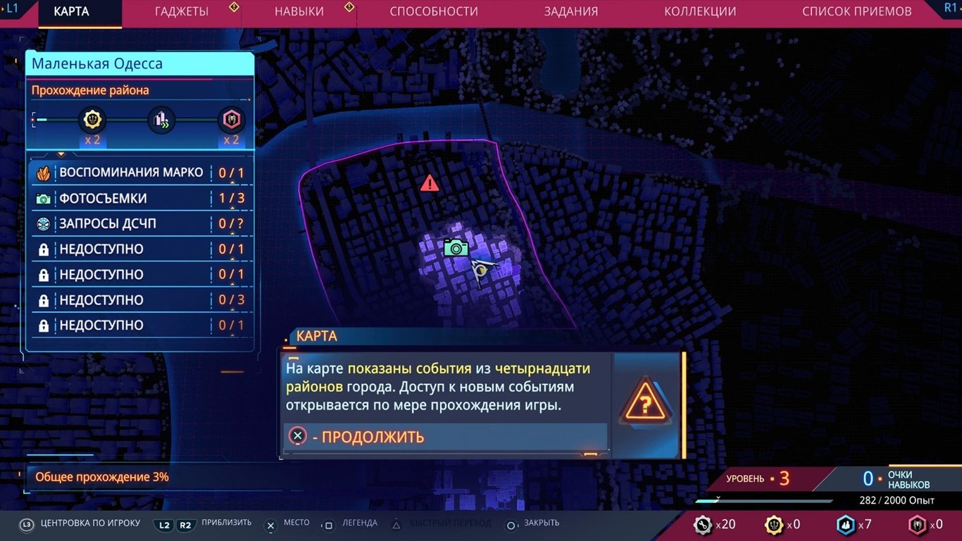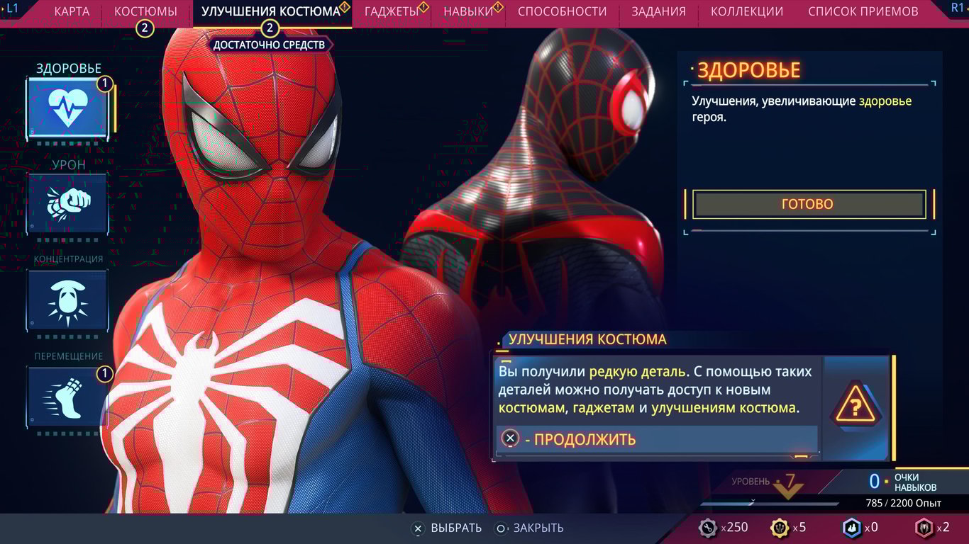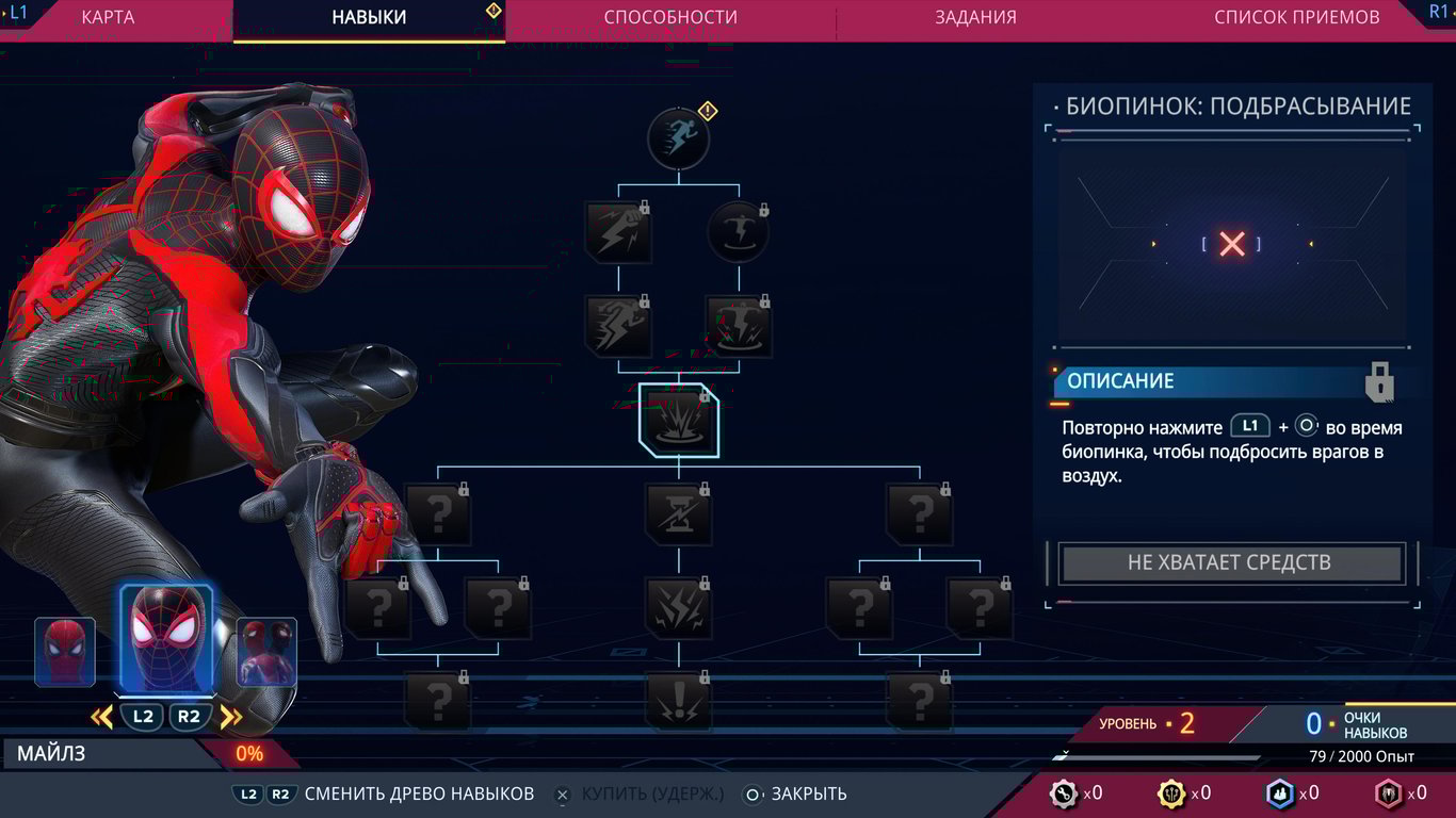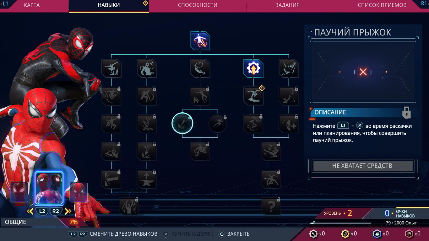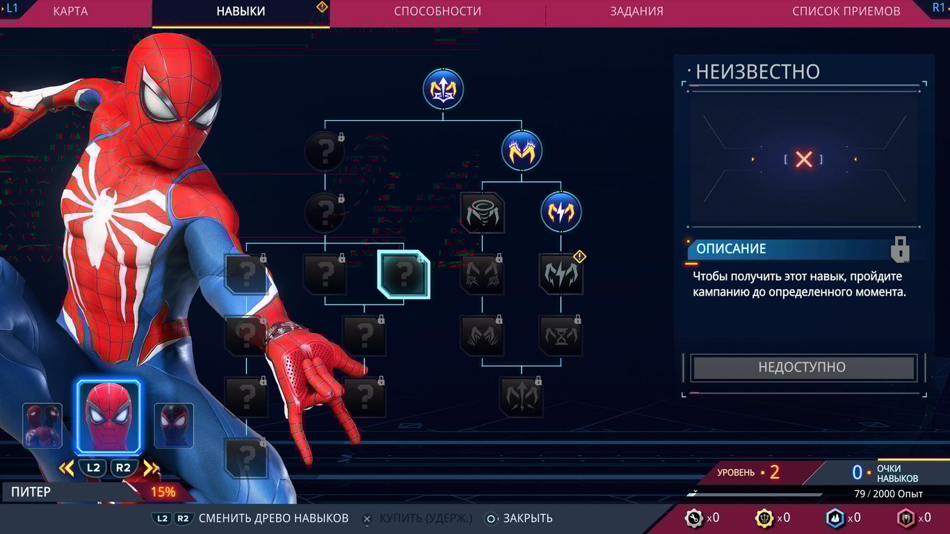 Помимо выбора способностей, с повышением уровня даются очки навыков, которые необходимо вкладывать в прокачку, вы не поверите, навыков. У каждого из Пауков есть своя панель, плюс есть общие, где в основном собраны навыки, присущие обоим Паукам – вроде использования паутины. Для прокачки изначально доступны не все навыки, некоторые закрыты до прохождения определённых моментов сюжета. За полную прокачку персонажа спокойно открываются все навыки, плюс ещё зачем-то остаётся 5 лишних очков, которые потратить никуда нельзя… Хорошо, что хоть не закрыли часть способностей за НГ+, как это было в игре про Майлза.