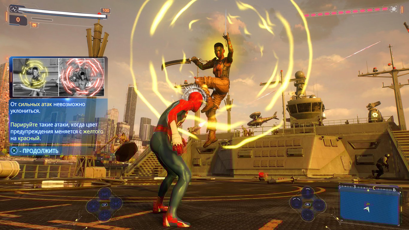 Интереса добавляет и то, что во время парных миссий у каждого из персонажей появляются совместные добивания, которые можно активировать в любой момент боя. Причём каталог совместных добиваний разный для Майлза и Питера.