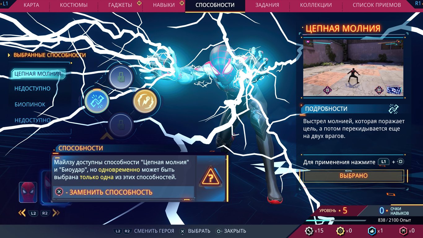 У каждого Паука есть свой набор способностей, который можно менять по мере прохождения игры – и обретения новых навыков каждым из Пауков. У Майлза по началу есть весь набор способностей из его игры, но потом открываются новые. Например, вместо удара кулаком молнии можно использовать цепную молнию, атаку дальнего типа. К концу игры появляются альтернативы каждой из четырёх способностей, что позволяет настроить билд согласно своим предпочтениям.