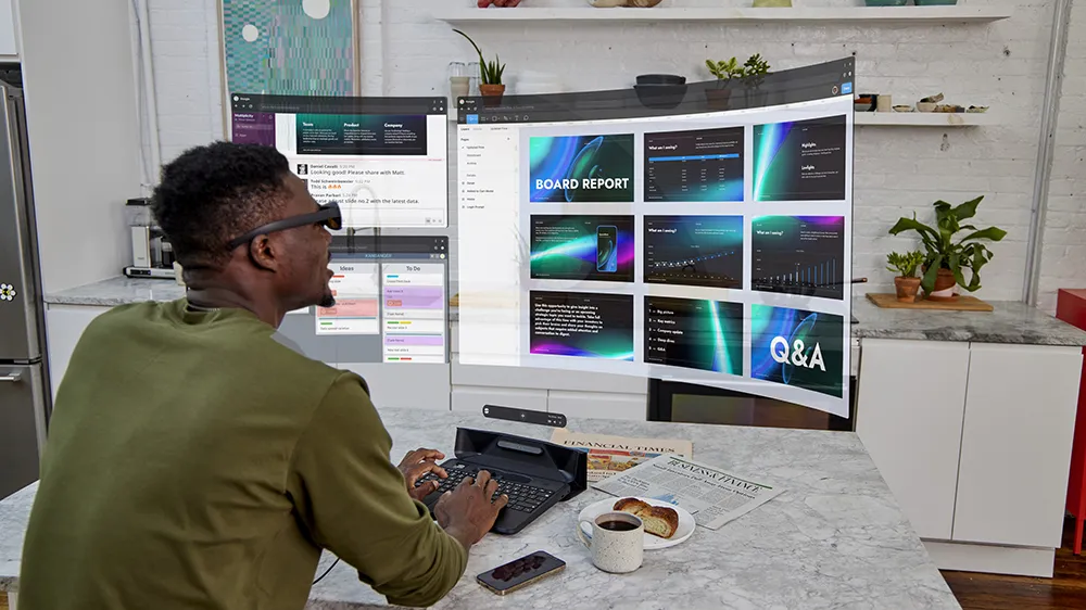 Spacetop Sightful комплектуется очками дополненной реальности. Изображение с ноутбука выводится именно на них. Производитель утверждает, что в поле зрения можно разместить до 10 окон одновременно, что упрощает многозадачность (или наоборот).