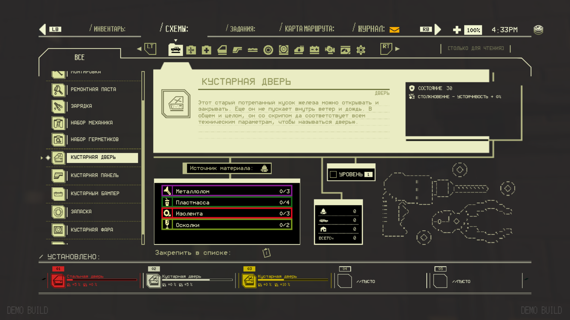 …но это сурвайвал. Так что сначала надо собрать дверь для автомобиля, молоток для разбивания стекла, контейнеры плазмы для радиостанции и так далее. И размеренные поездки неожиданно превращаются в беготню по локациям и обыск каждого мусорного ведра, ведь в них есть пластмасса и металлолом.