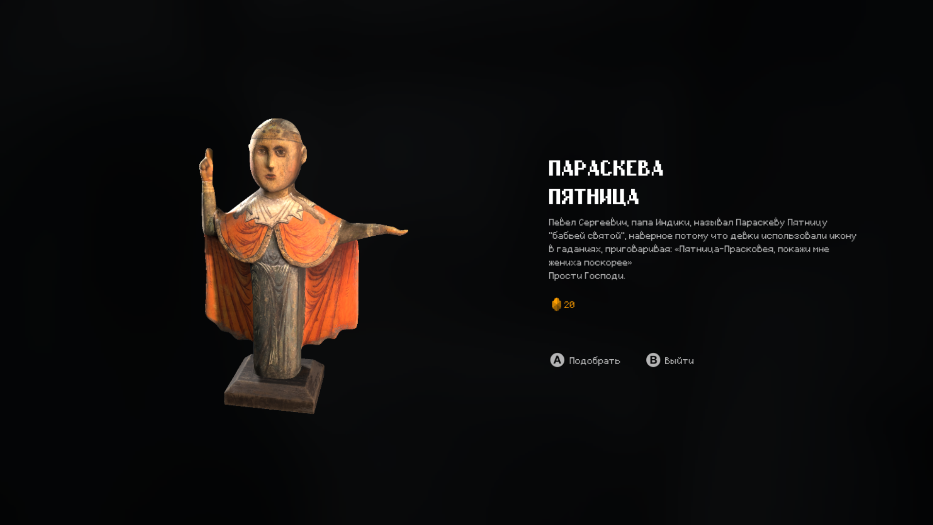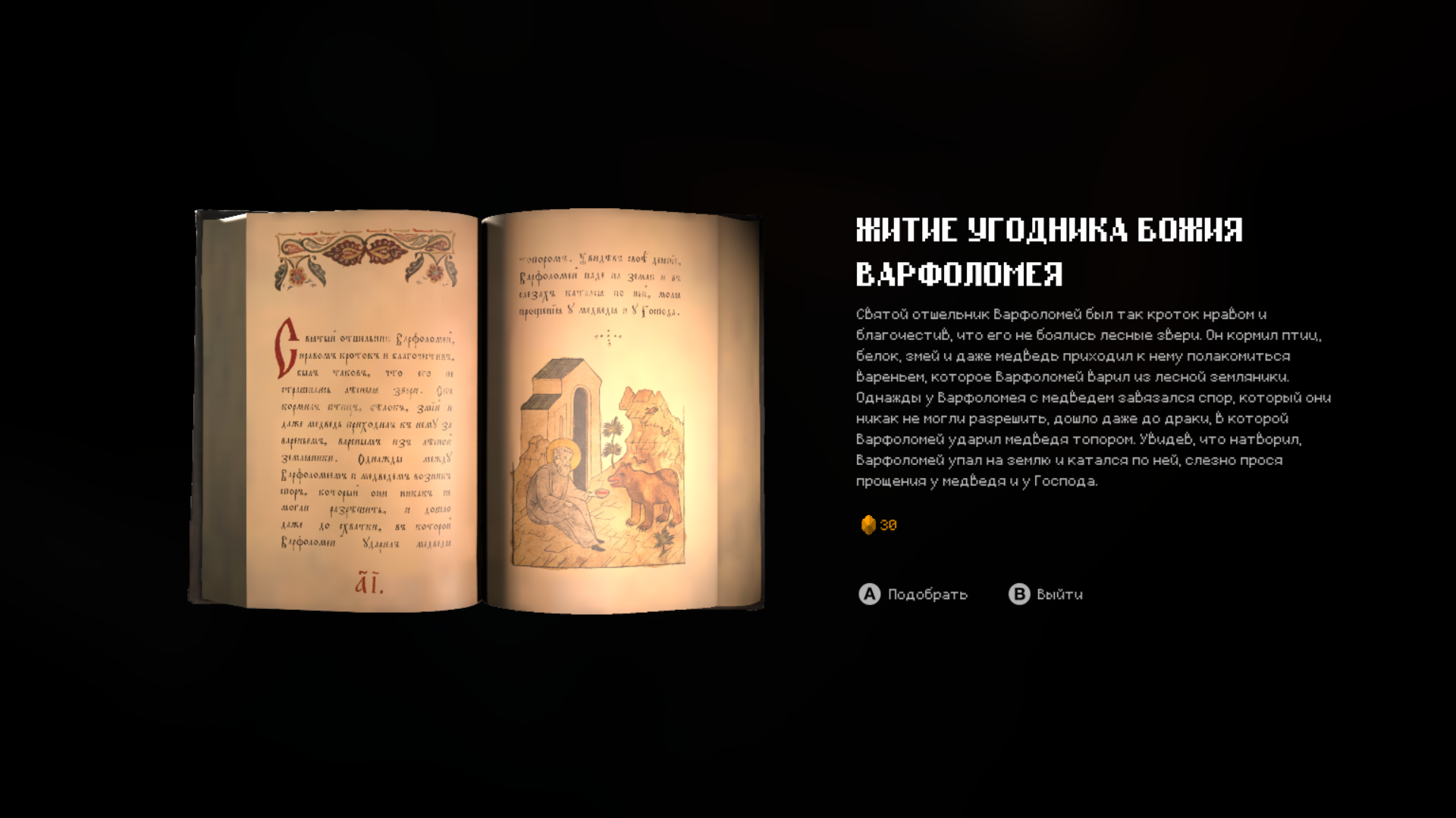 Как и положено современной игре, тут есть коллекционные предметы. Как и положено игре про религию, эти коллекционные предметы – евангелия и религиозные фигурки. Как и положено современной игре, тут есть прокачка. Опыт добывается молитвой у икон. Как и положено игре про религию, ветки прокачки – это всякие «покаяние» и «стыд».
