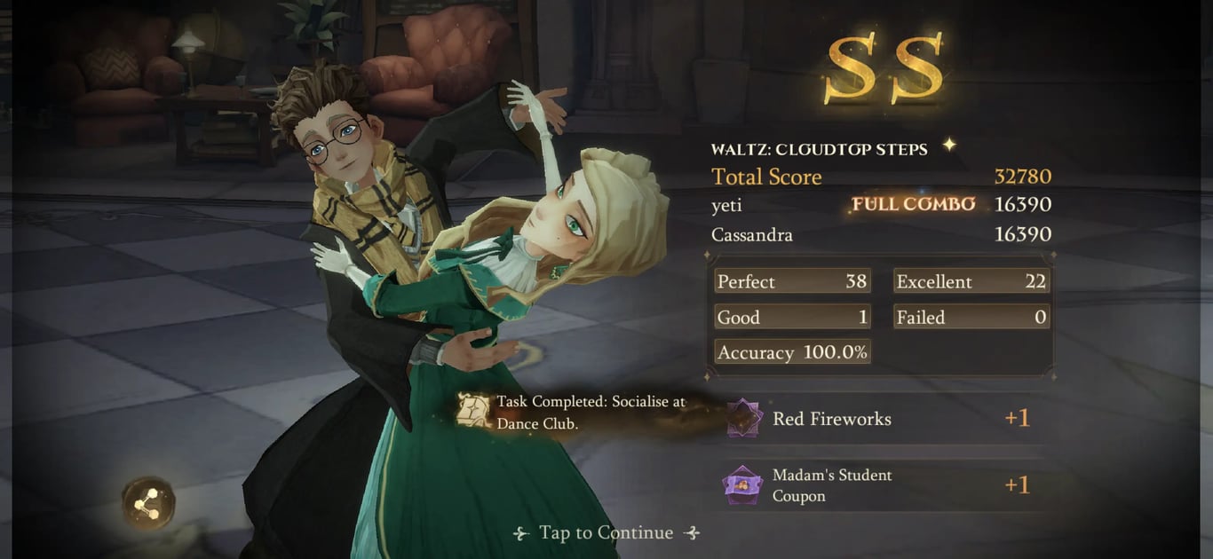 Оценка за танцы складывается из оценок обоих игроков. То есть, если ты очень точно и круто нажимал кнопки в нужном порядке, а твой партнёр отвлёкся попить чаю, то оценка будет низкой. Для вас обоих. С другой стороны, ты тоже можешь подложить партнёру подлянку и пойти пить чай вместо ритм-игры. Но таких злодеев в Хогвартсе не любят! Это же милая игра!