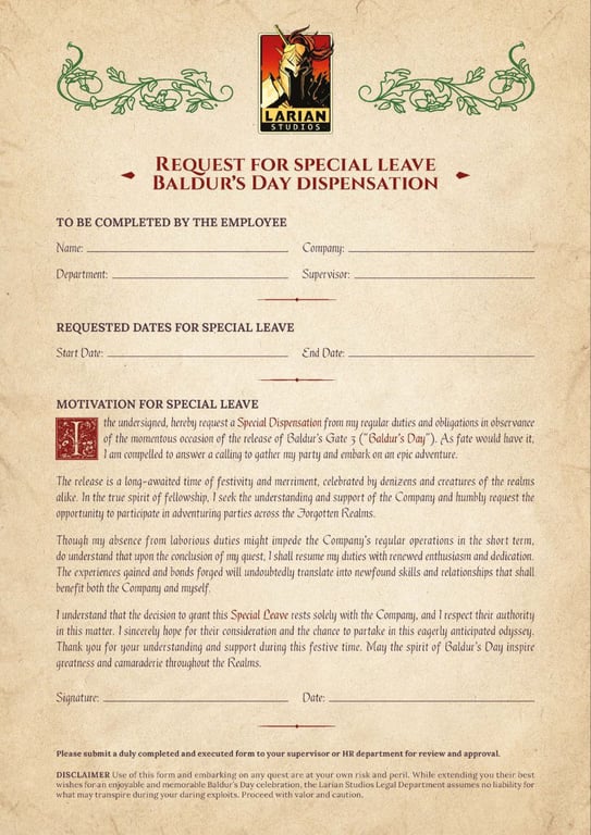 28 июля Larian Studios запустили новый флешмоб – они выпустили «записку для руководства». Предполагалось, что человек подаст эту записку своему директору, а тот отпустит сотрудника в отпуск поиграть в Baldur’s Gate 3.