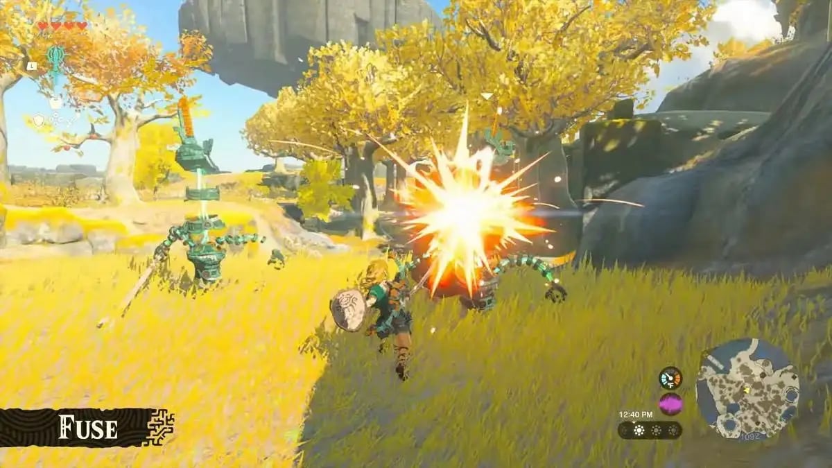 TotK не скупа на монстров, как и не скупа на механики боя. Урон здесь можно нанести самыми разными способами – помимо банальных ударов одноручным или двуручным оружием и стрельбы, можно проявить смекалку: столкнуть камень на врага, поджечь бочки с топливом близ лагеря, построить робота-убийцу с помощью ремёсел Зонаи, использовать способности Линка и т.д.