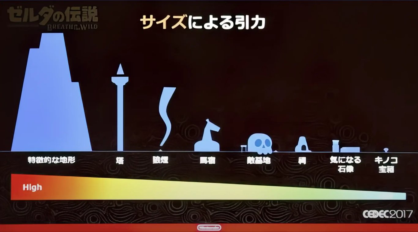 В «Зельде» у мест притяжения (аттракторов, объектов, привлекающих внимание – тех самых «увидел») есть своя иерархия, назначение, примерное время взаимодействия – но суть не в этом. Аттрактором является всё, даже трава (её можно косить), и это и создаёт вариативность – игрок сам выбирает, куда пойти и что делать.