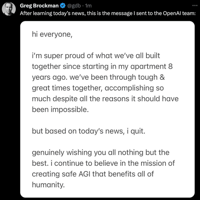 Альтман оказался не единственной жертвой. Также кресло председателя совета директоров потерял Грэг Брокман, сооснователь компании, её первый СТО и президент.