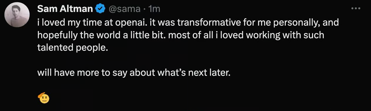 Оказалось, что увольнение Альтмана было «блицкригом» (нем. Blitzkrieg — «молниеносная война») совета директоров. Альтман даже не подозревал о своём увольнении, когда 16 ноября получил приглашение на рабочую полуденную встречу с Ильёй Суцкевером. Именно он выступил инициатором увольнения Сэма. А уже через полчаса об увольнении Альмана узнал весь интернет.