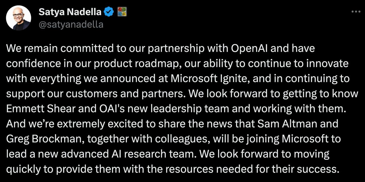 Однако в этот же день становится известно, что Альтман переходит в Microsoft. Глава компании, Сатья Наделла, сообщает о создании новой группы для работы над ИИ во главе с Альтманом и Брокманом.