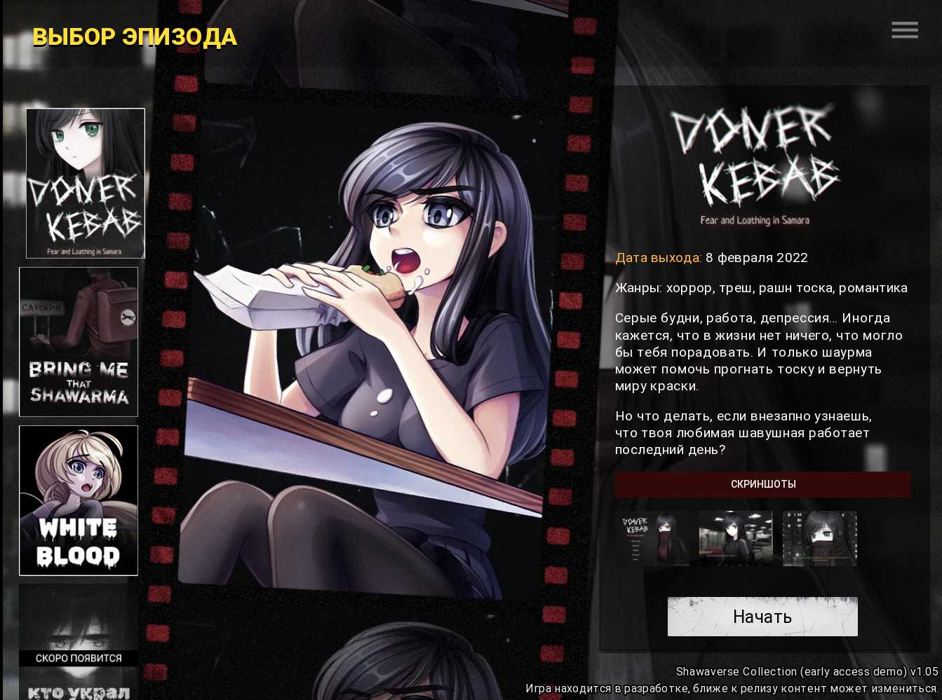Первая и третья связаны общим сюжетом о девушке, которая обожает шаурму, но попадает из-за этого в необычную историю. В них всё линейно и выборы игрока мало влияют на сюжет, но могут его расширить.