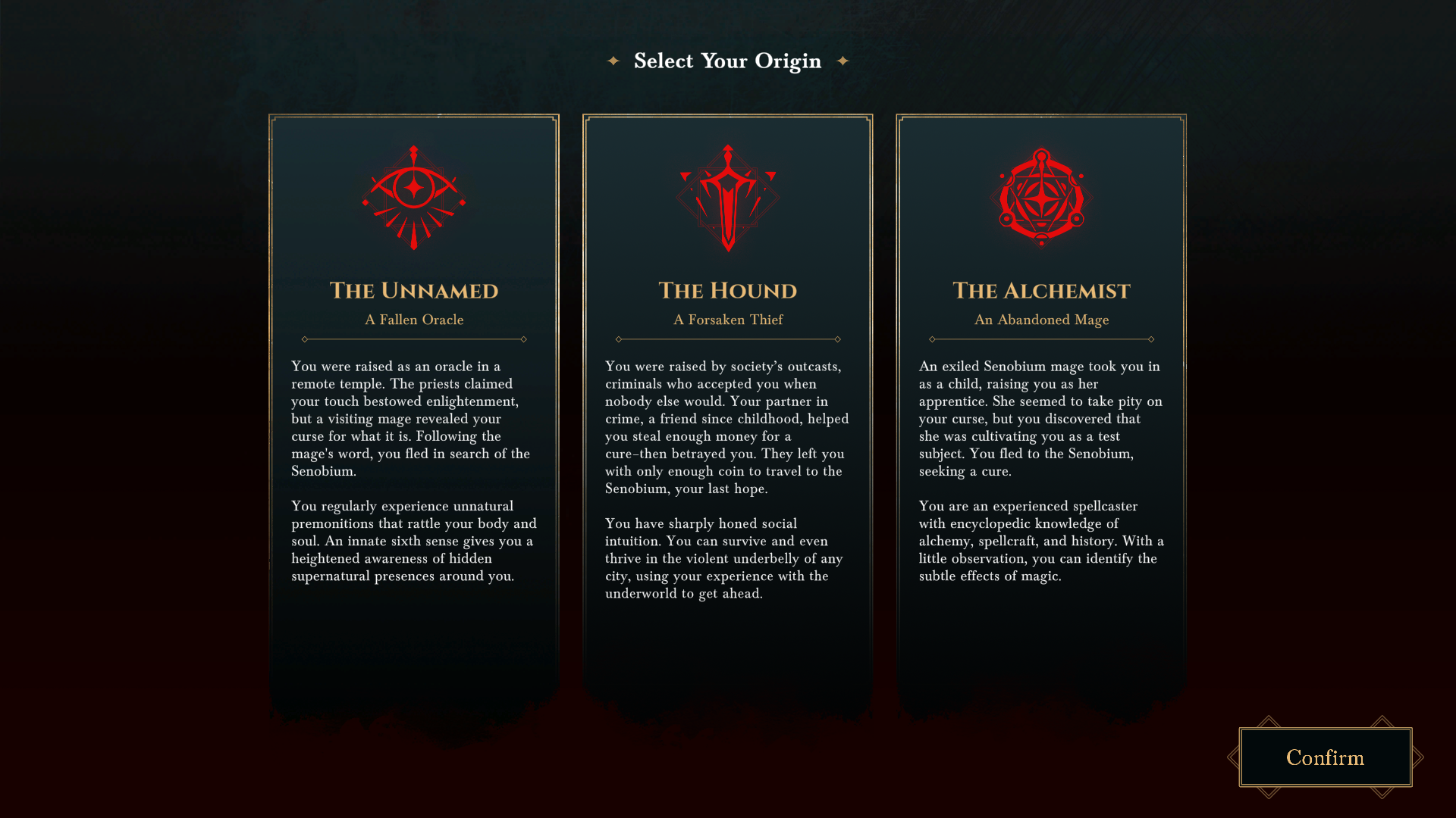 В начале игры сразу предлагается выбрать свою историю. На выбор три варианта: Безымянный, Гончая и Алхимик.