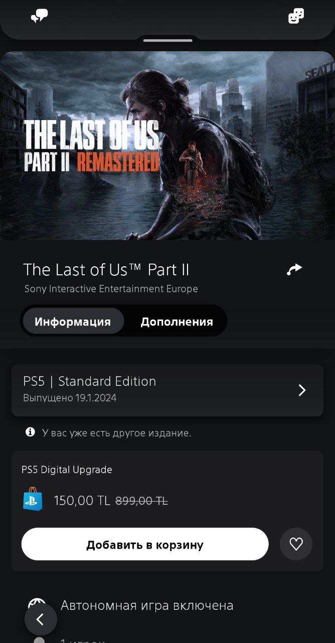 Обновить The Last of Us: Part II до PS5-версии можно только на том же аккаунте, где у вас куплена PS4-версия. То есть обновить цифровую версию из российского PS Store через турецкий PS Store не получится.