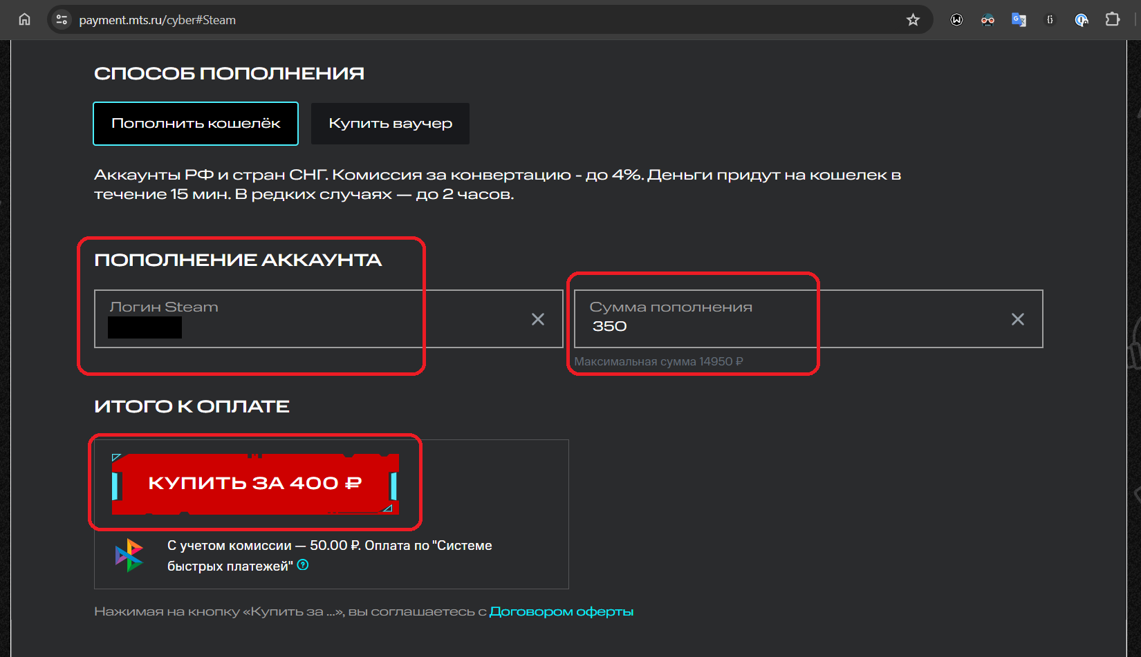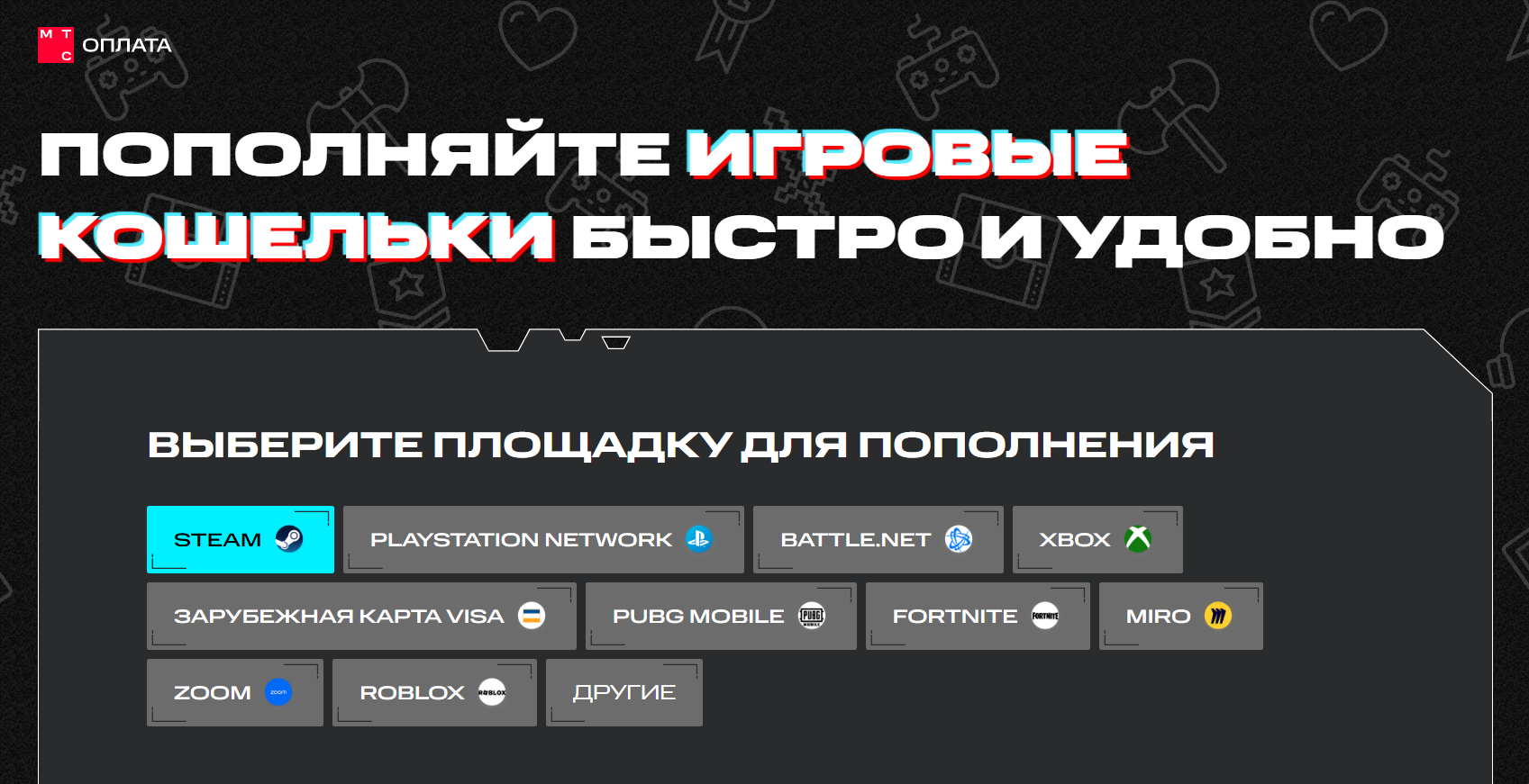 1. Откройте страницу https://payment.mts.ru/cyber#Steam. Это пополнение непосредственно Steam.