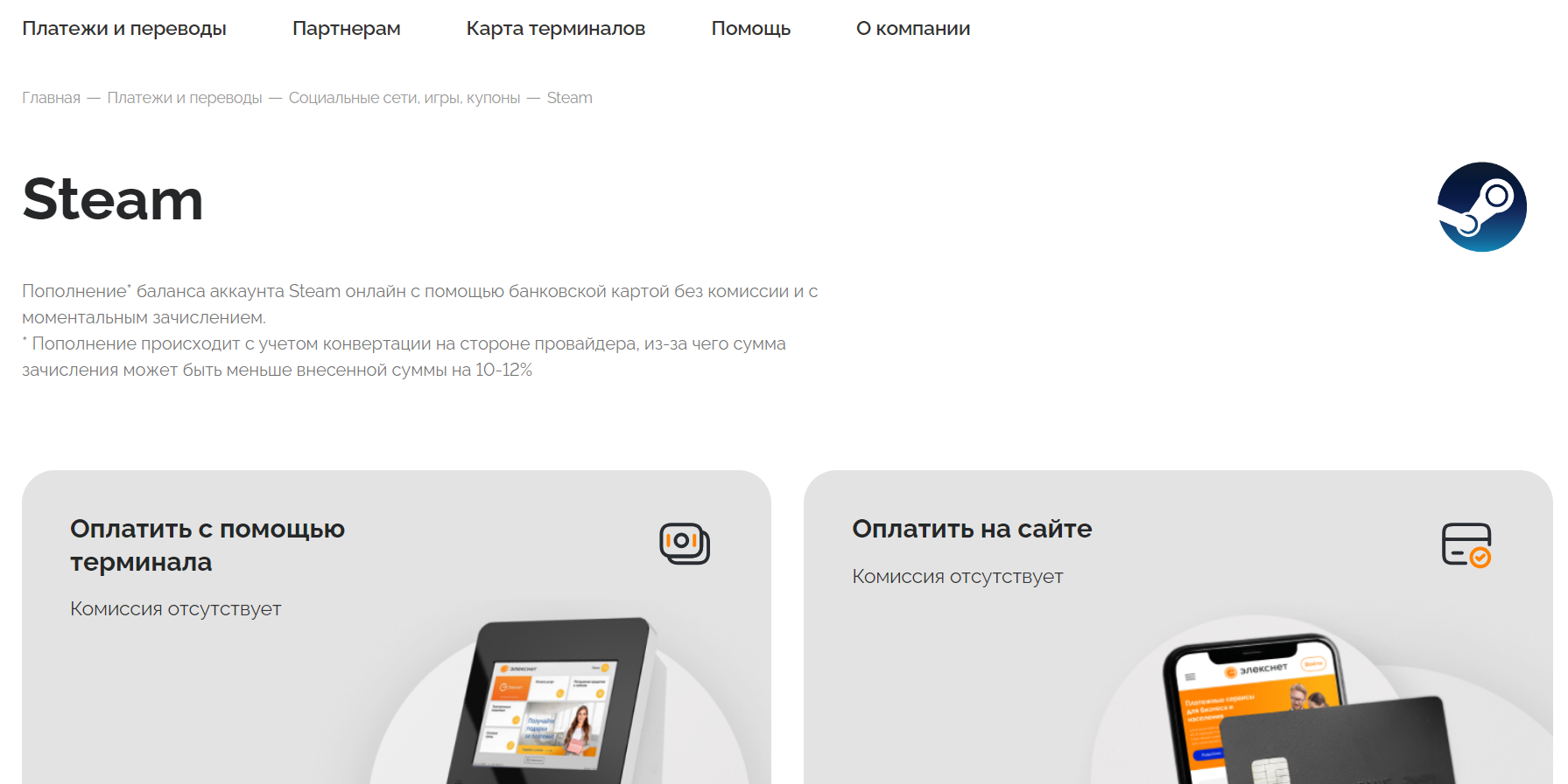 1. Откройте страницу пополнения Steam на сайте «Элекснет»: https://1.elecsnet.ru/NotebookFront/services/0mhp/default.aspx?merchantId=36386. Можно также перейти на главную страницу сервиса https://elecsnet.ru/payments/sotsialnye_seti_igry_kupony/steam/ и выбрать «Оплатить на сайте».