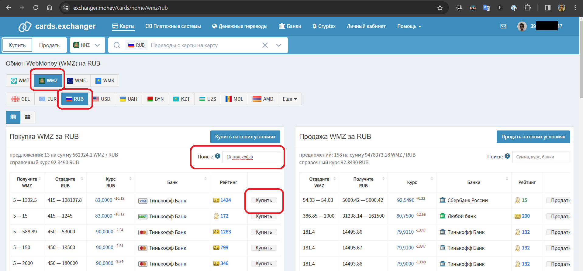 3. В строке «Поиск» пишем сумму WMZ, которую хотим купить, и название нашего банка – как на скриншоте («10 тинькофф», то есть я покупаю 10 WMZ и хочу оплатить Тинькофф). Напоминаю, 1 WMZ – это 1 доллар. Только вебманизированный.