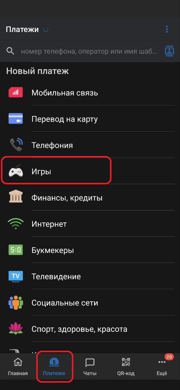 1. Открываем «Платежи» и находим пункт «Игры».