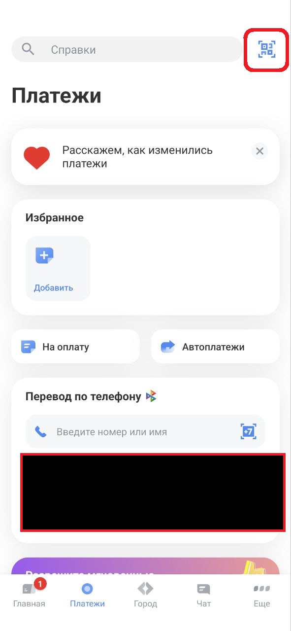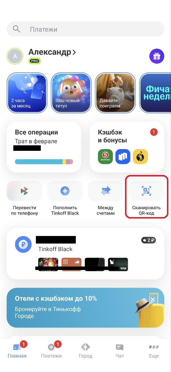 6. Откройте приложение вашего банка и найдите в нём кнопку «Сканировать QR-код». Например, в последней версии «Тинькофф» она прямо на главном экране, а также на странице «Платежи» в правом верхнем углу.