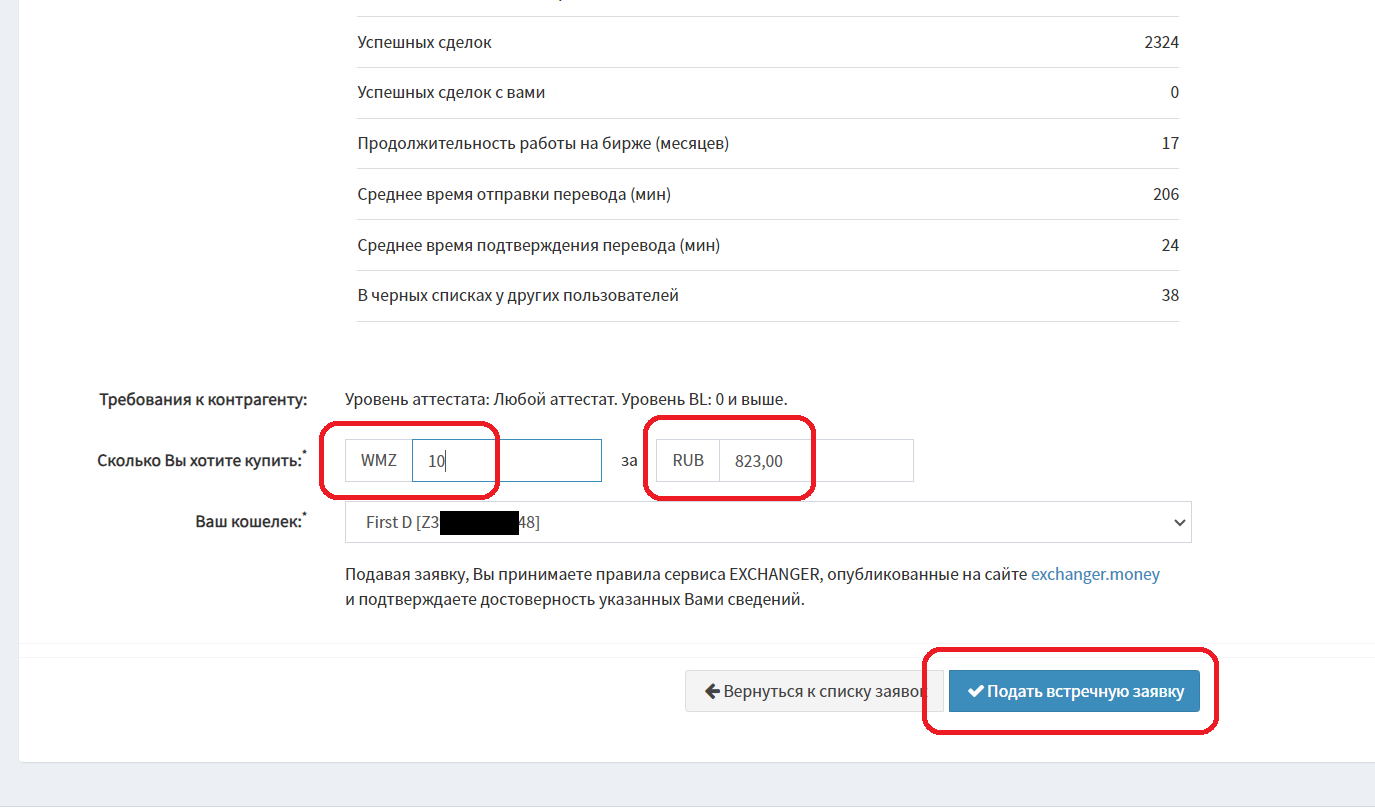 5. Открывается страница ордера. Пролистываем в самый низ, снова указываем нашу сумму в WMZ и нажимаем «Подать встречную заявку».