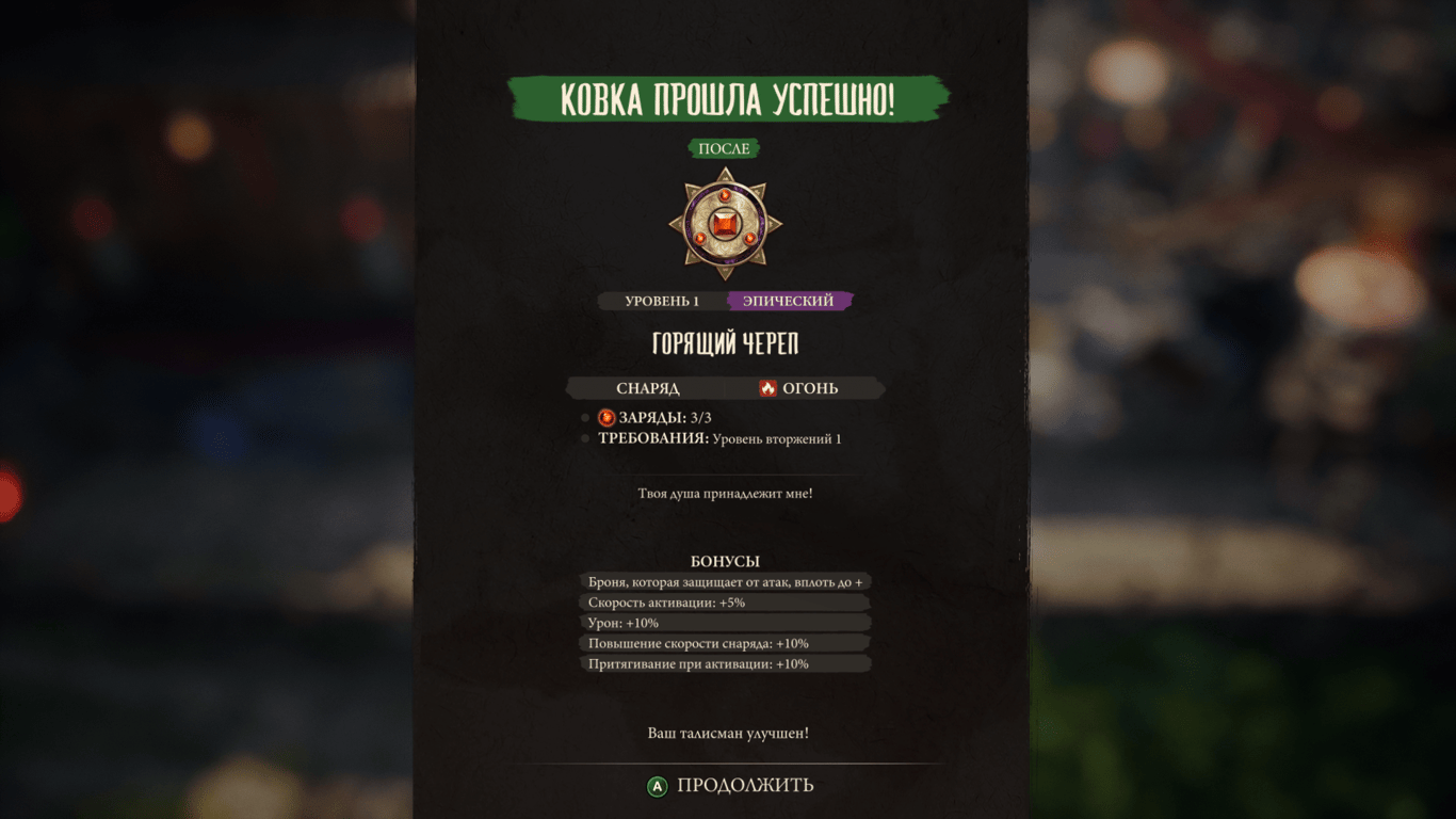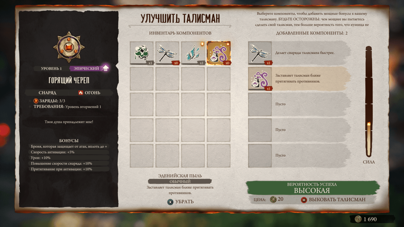 В Кузнице также можно улучшить талисман, увеличив урон, добавив дополнительные эффекты или сменив стихию атаки. Для улучшения нужно использовать различные компоненты, которые можно найти на карте по мере прохождения.