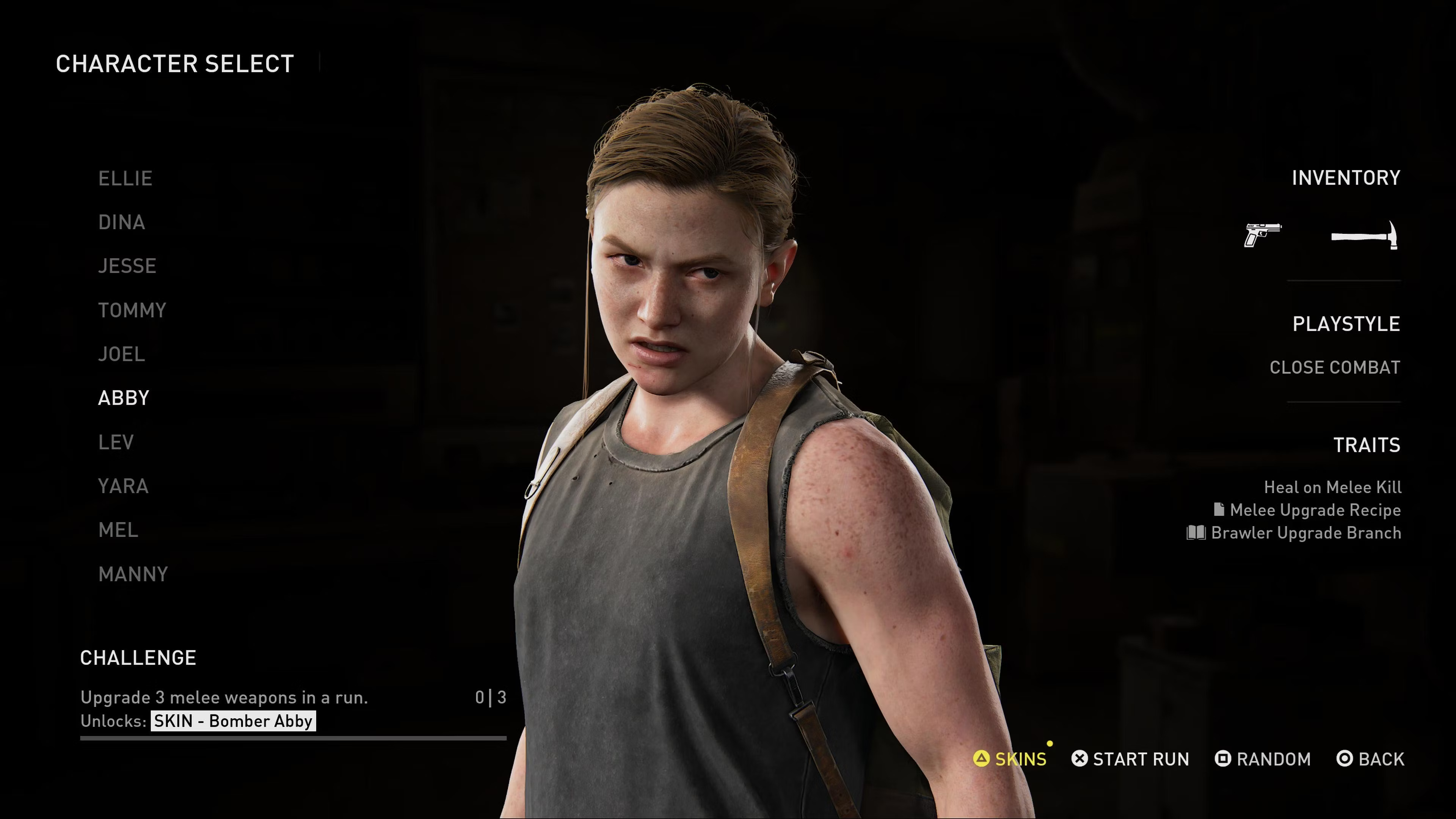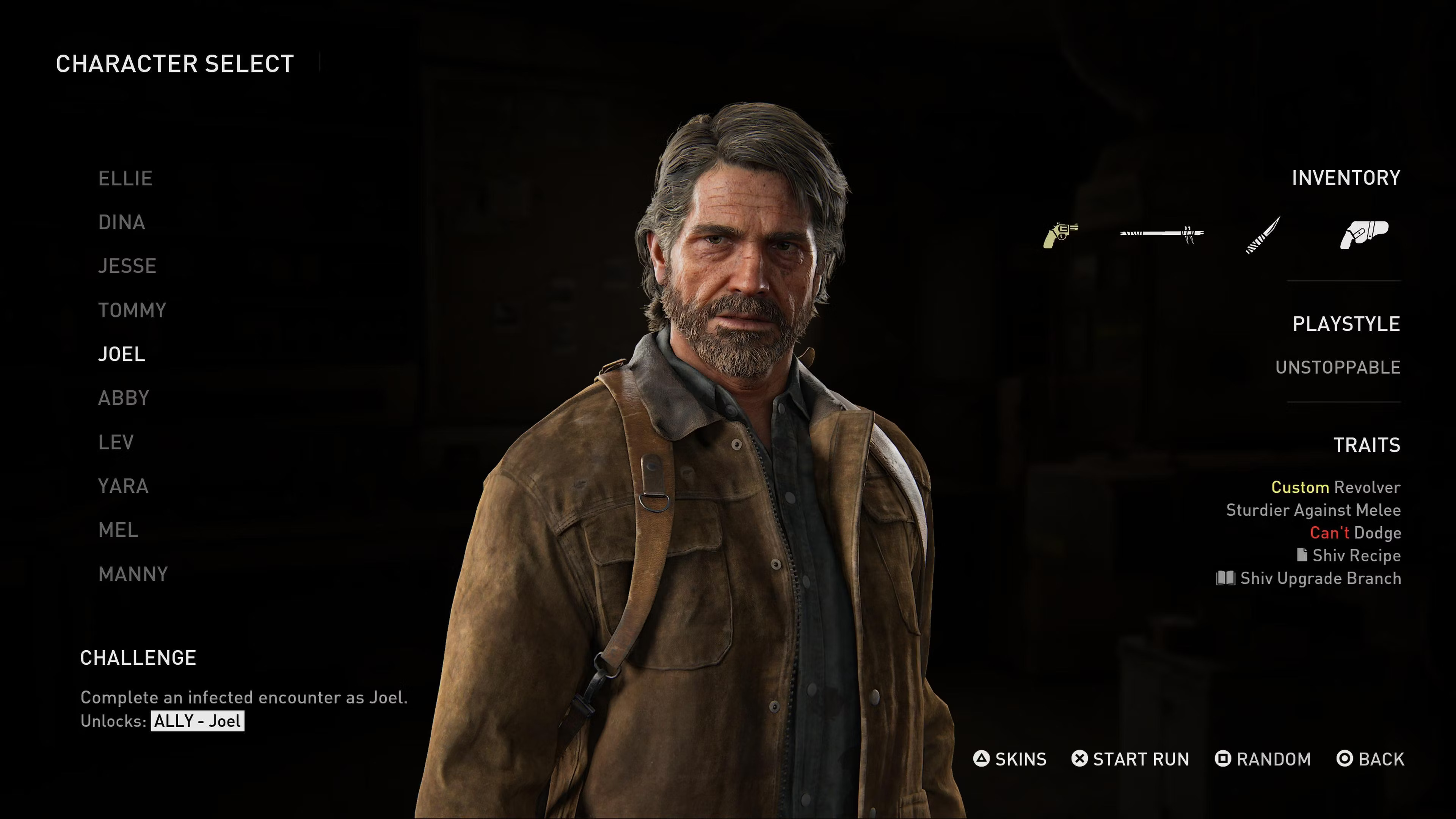 Джоэл – стартовое оружие: револьвер, улучшенное оружие ближнего боя с 3 уровнем прочности, заточка; навыки: повышенная устойчивость в ближнем бою, не может уворачиваться, может крафтить заточки, ветка прокачки заточек.