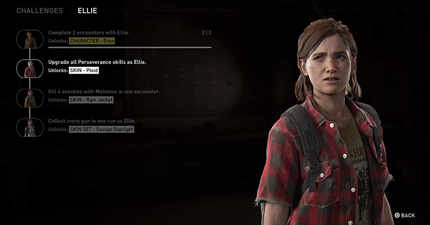 Для персонажей можно выбрать скины. Открытие новых требует выполнения определённых действий. Например, для Элли: