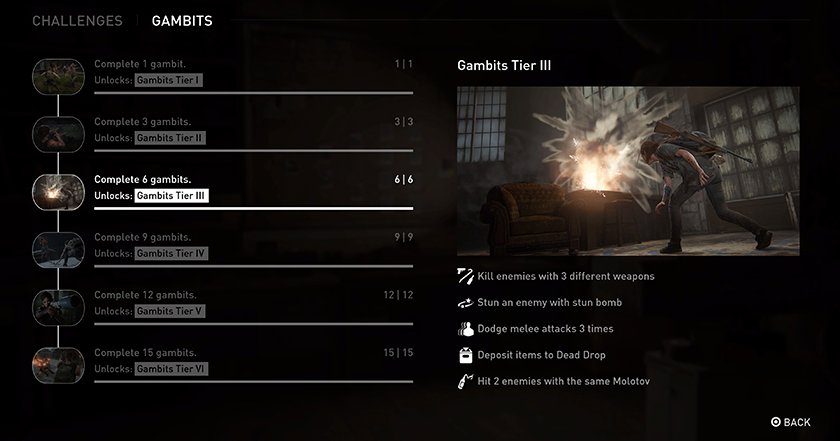 Некоторые гамбиты доступны только для определённых персонажей, некоторые – для всех. Например, у Элли есть 4 собственных дополнительных задания: выиграть два уровня, прокачать одну из веток, убить 4 врага коктейлем Молотова и собрать всё возможное оружие во время рана.